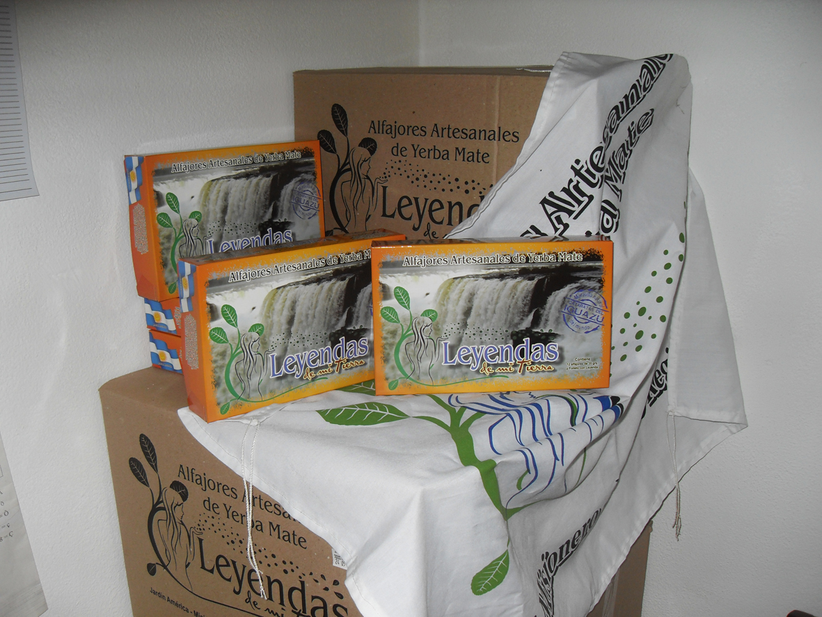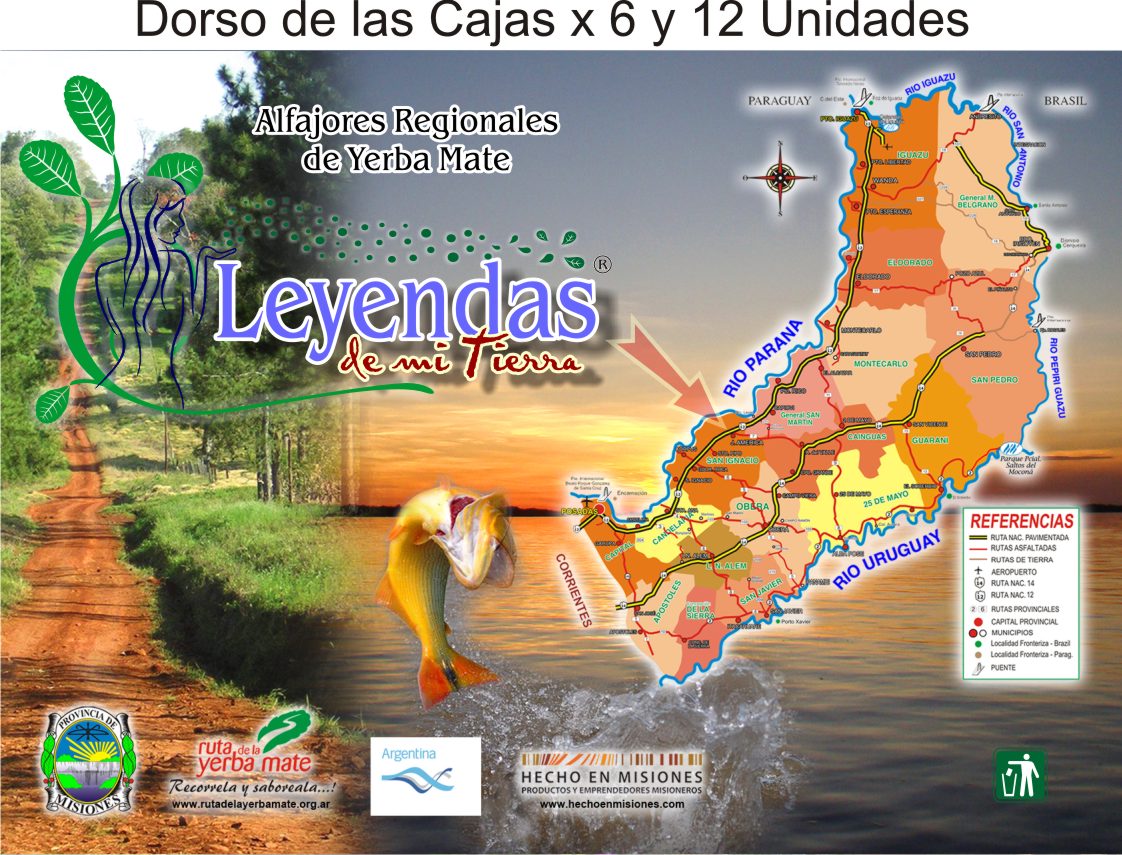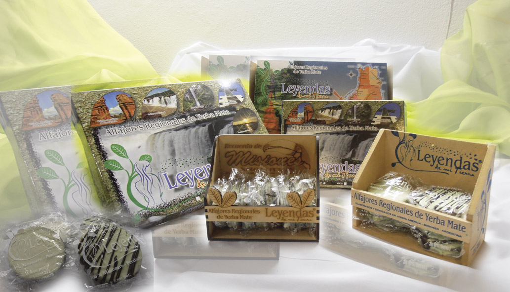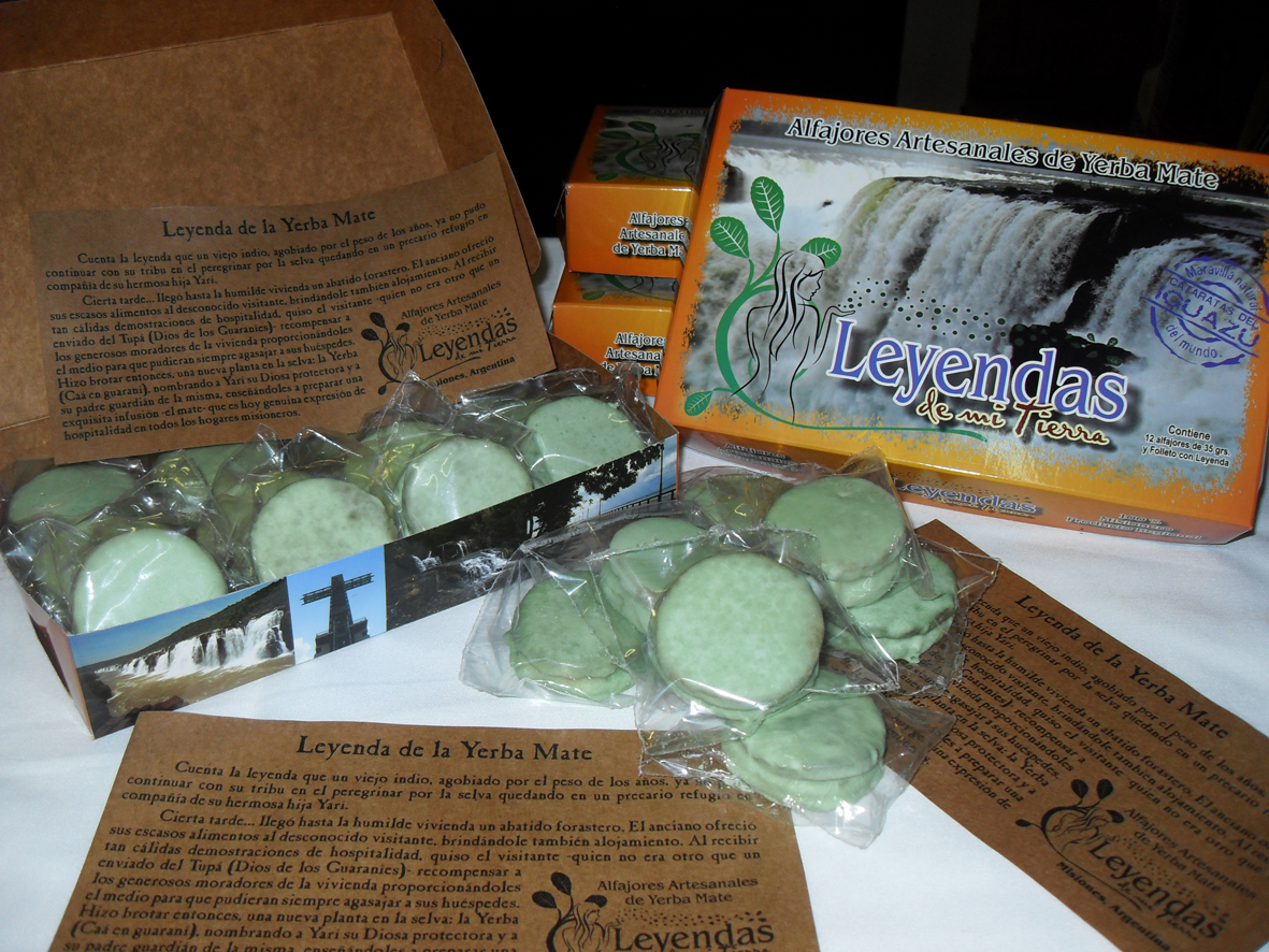Los alfajores “Leyendas de mi tierra” se envasan individualmente en bolsitas de polipropileno y van contenidas dentro de una cajita de cartón impresa en fotocromía y laminada, con el Logotipo, imágenes turísticas, Mapa rutero, Escudo de Misiones, etc.